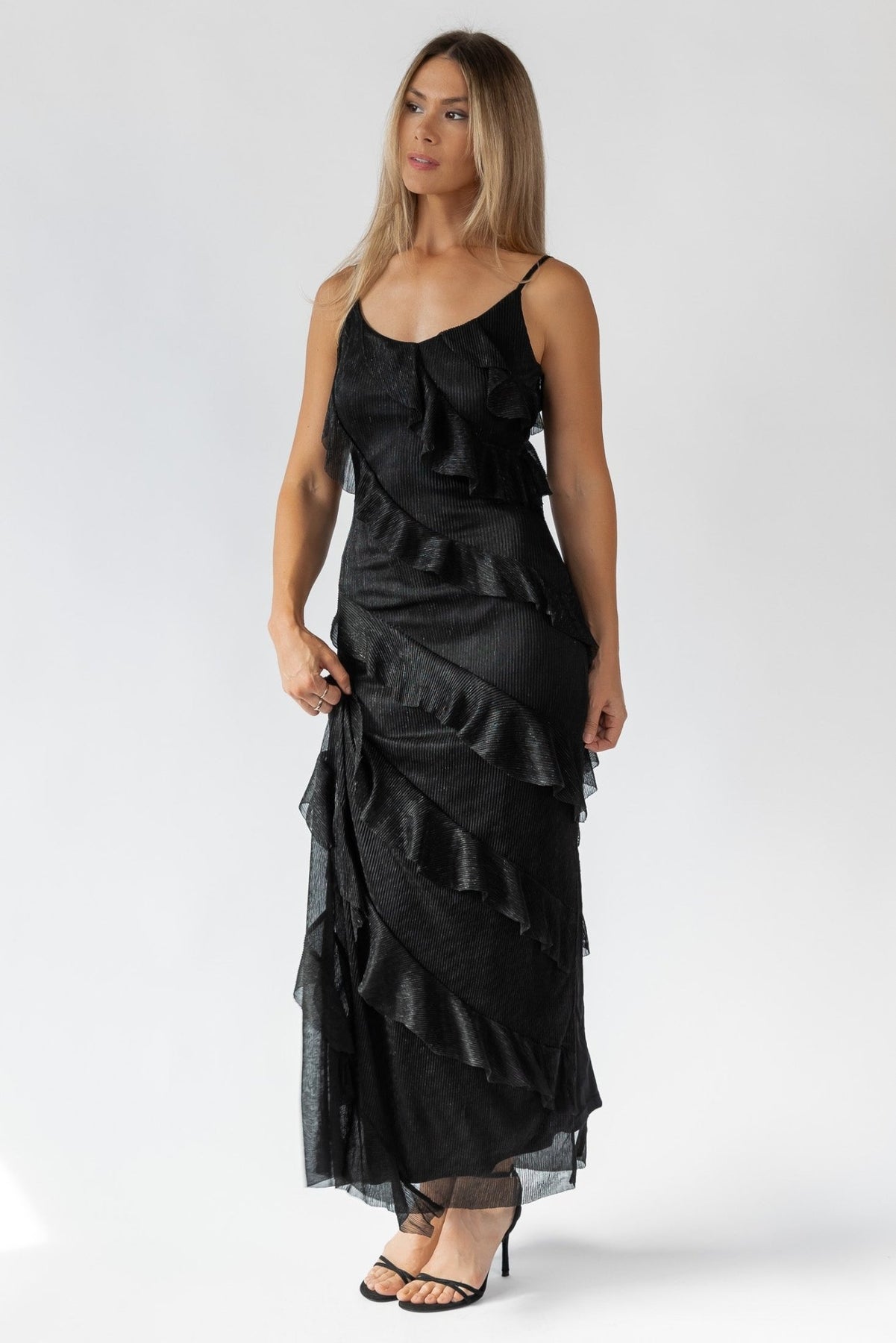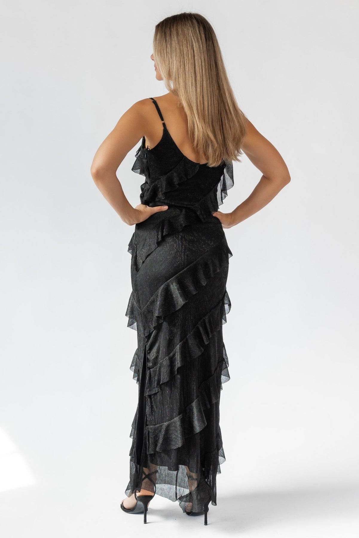 The Caelyn Black Metallic Ruffle Maxi Dress features adjustable spaghetti straps, a scooped v-neckline, and elegant asymmetrical ruffle details. This stunning little black dress has a side slit, making it perfect for any special occasion. Pair this dress with strappy heels and gold accessories for an effortlessly chic look.