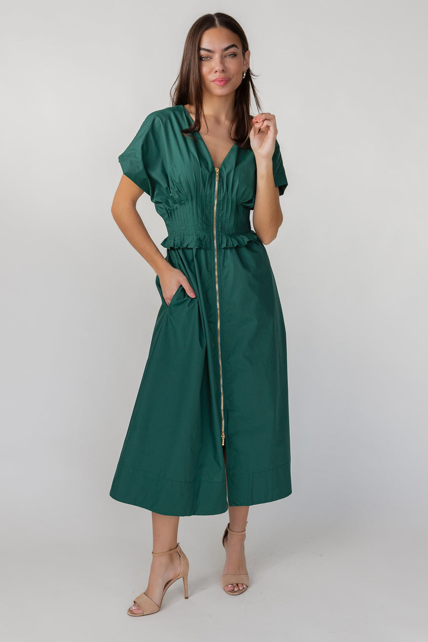 Meet Briar—a modern midi that’s equal parts sleek and easy. The deep-green woven drapes cleanly, while the smocked, pleated waist nips in for shape without feeling tight. A front zip adds just-enough edge; the tie-back keyhole keeps it feminine. Fully lined with side pockets, she’s an instant yes for dinners, showers, and all the in-between.