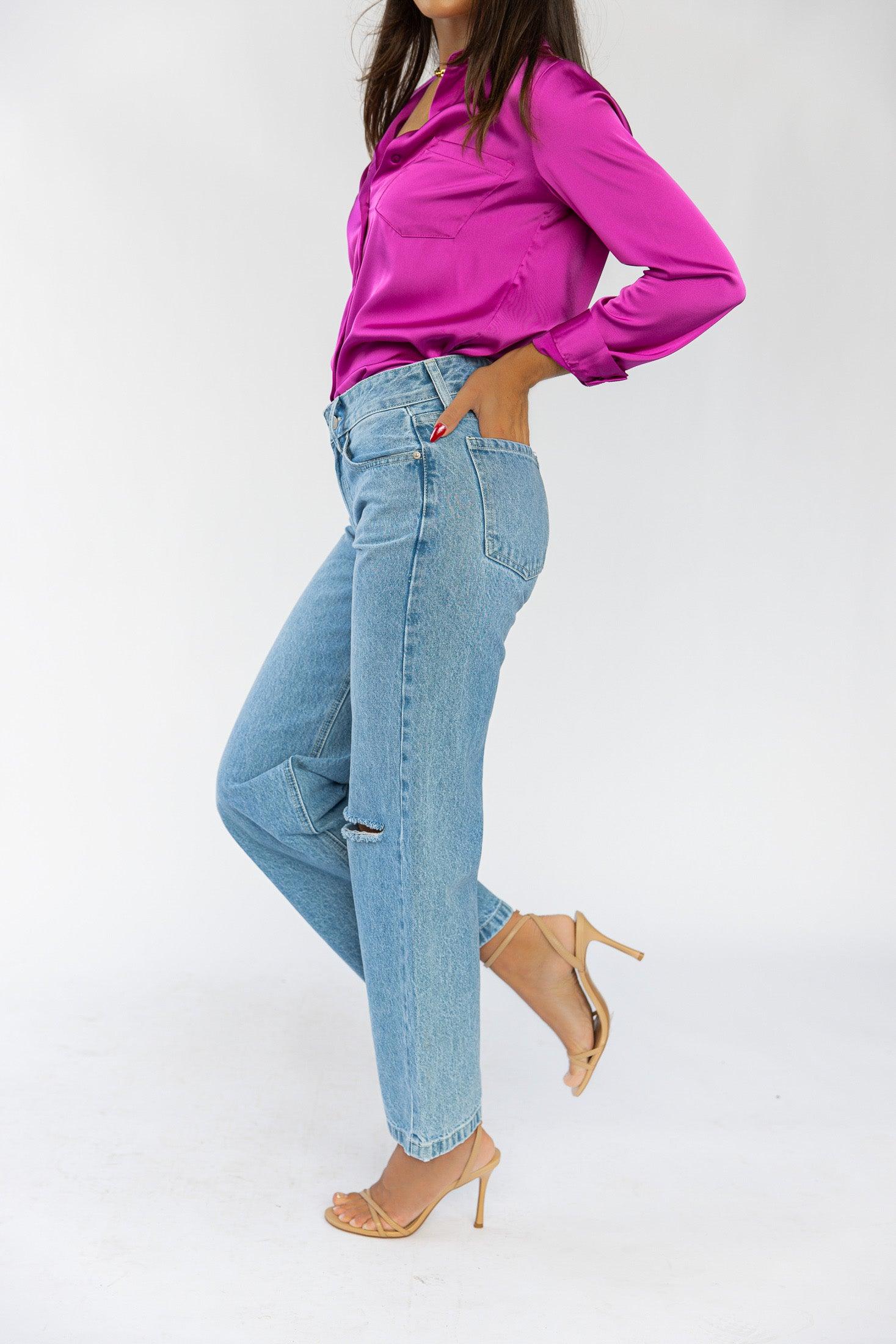 • Mid rise skater jean with knee slit