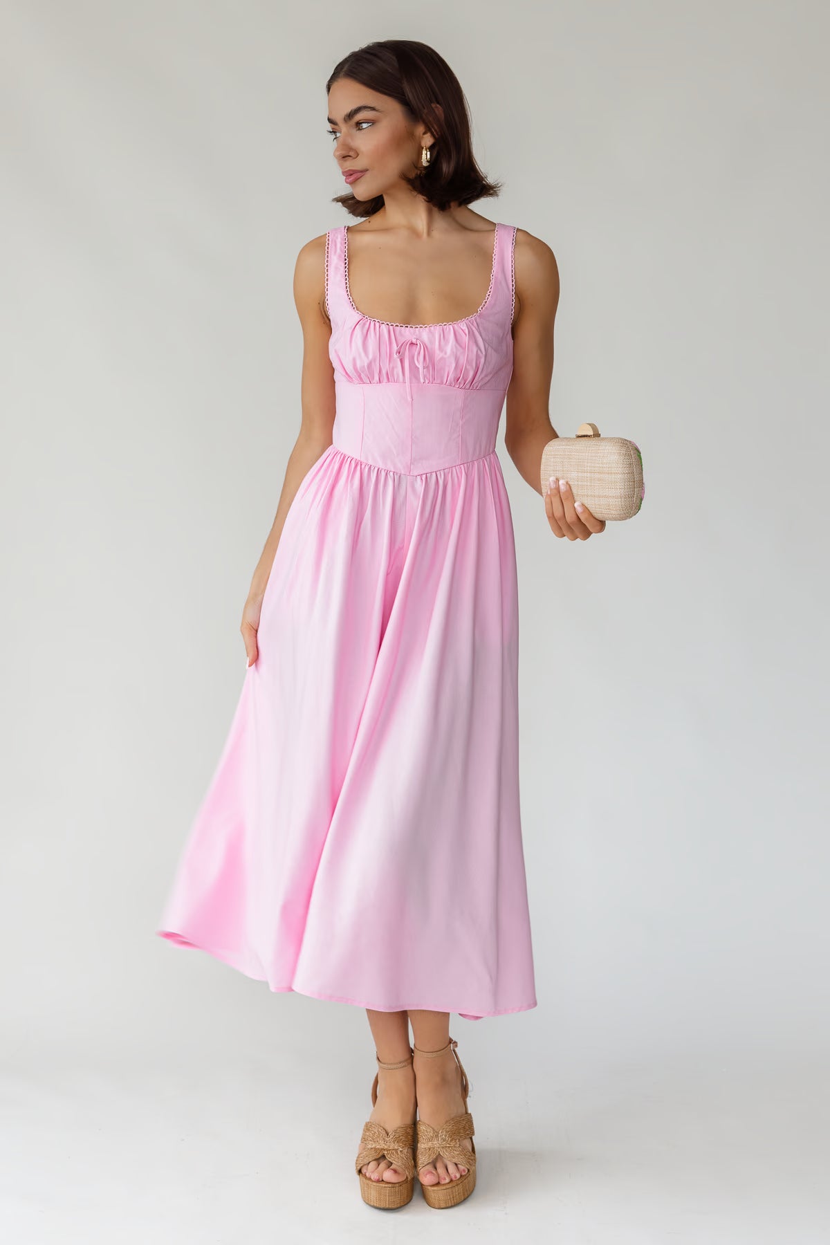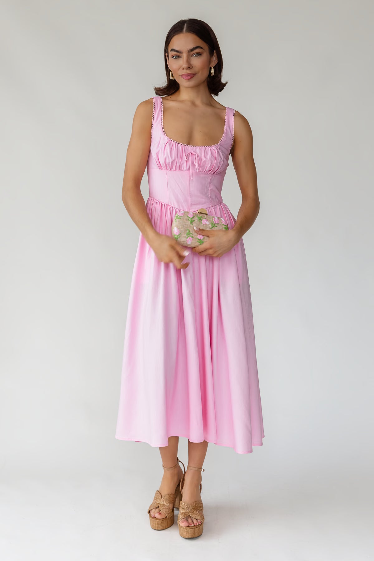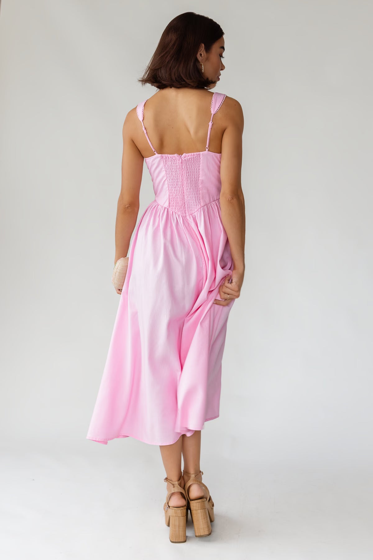 The square neckline and ruched princess waist create a flattering, structured look, while the smocked back and adjustable straps offer comfortable flexibility. Finished with an easy midi skirt and side pockets, it’s the kind of dress that feels just as right for brunch or showers as it does for summer celebrations.