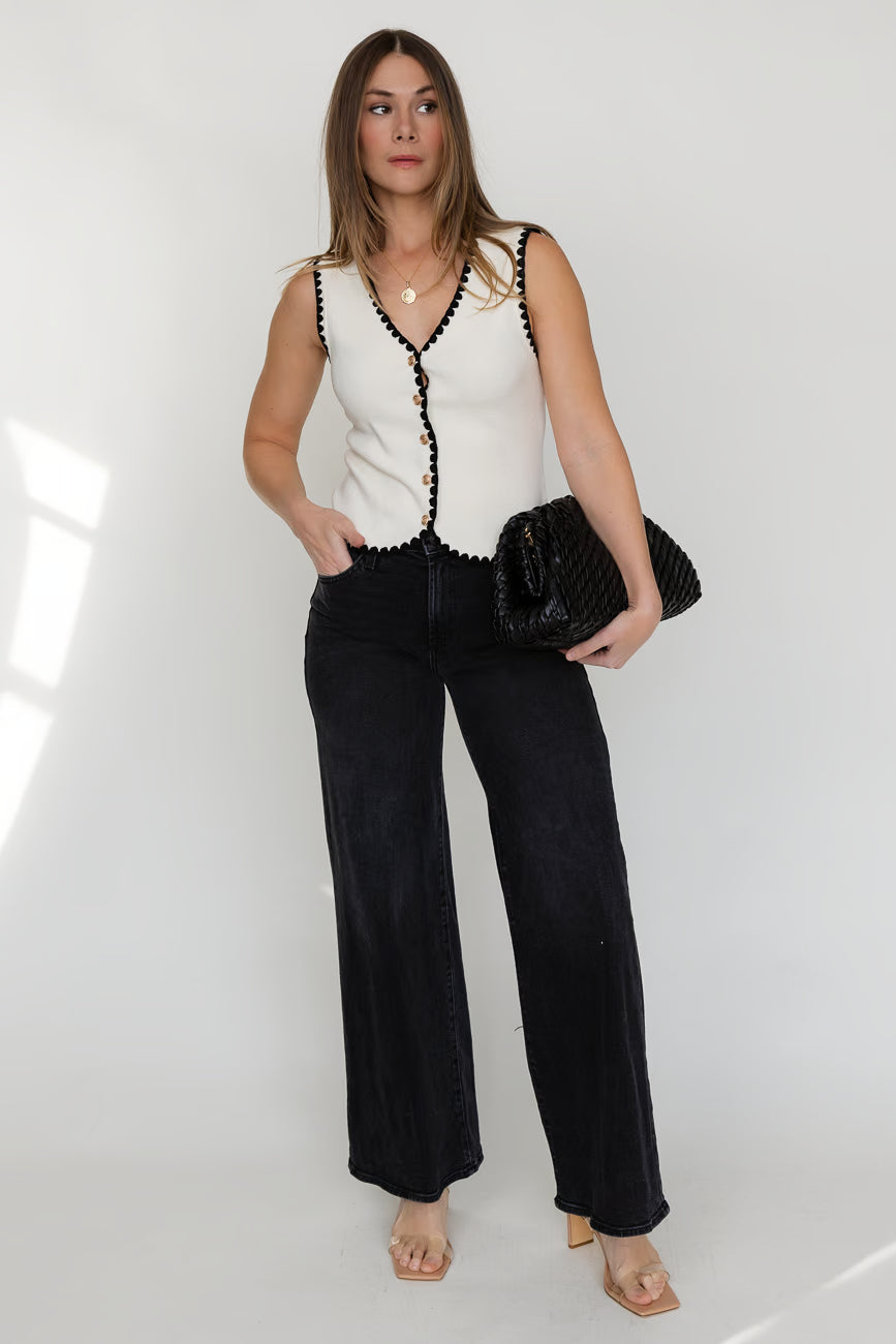 Chic and timeless, this sleeveless knit vest is detailed with gold buttons and scalloped trim for a polished finish. The tailored silhouette makes it a versatile layer for work or weekend wear.