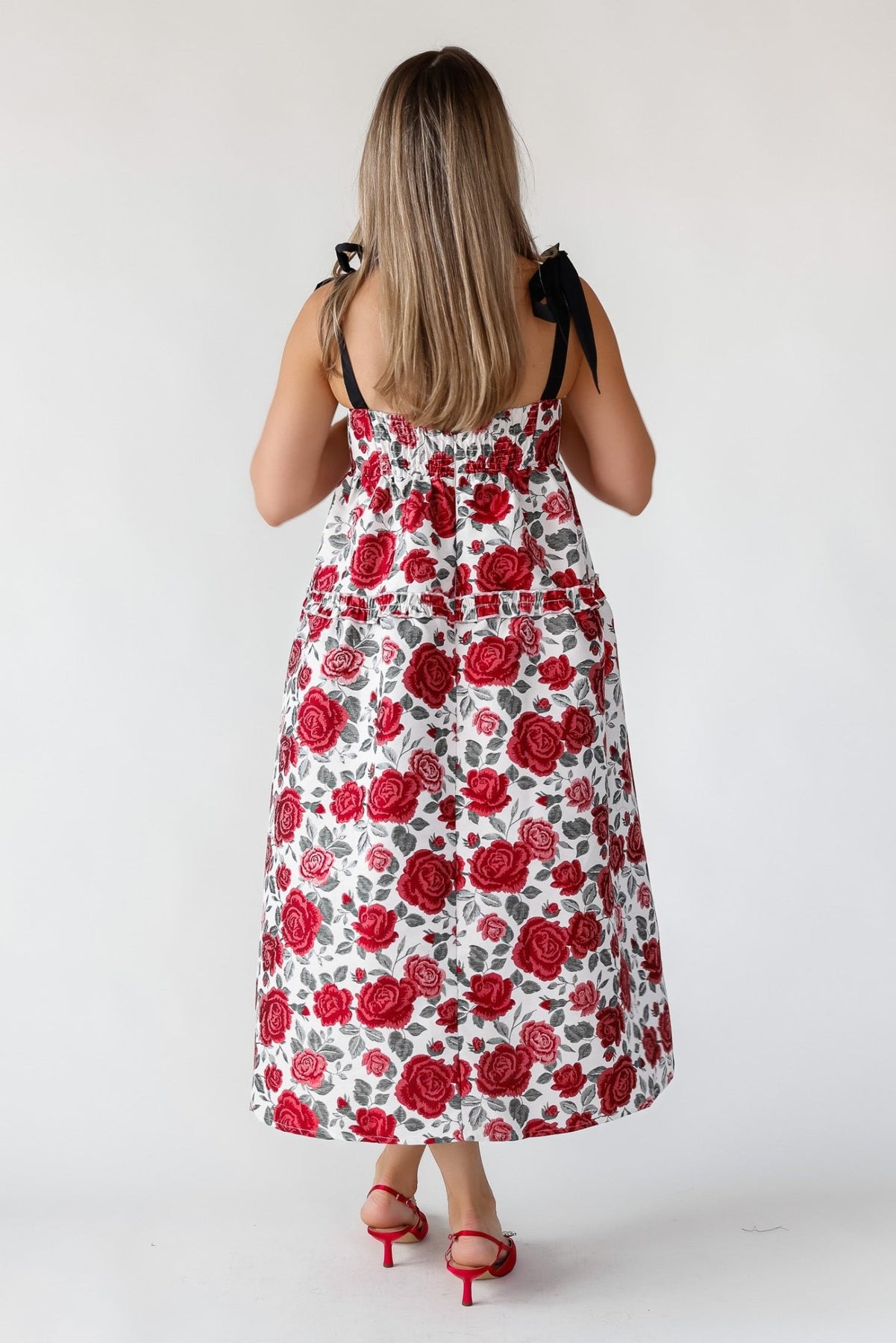 Make a bold statement in the Berklyn Roses Jacquard Midi Dress. With its vibrant floral jacquard and charming poplin ties, this dress is as romantic as it is eye-catching.